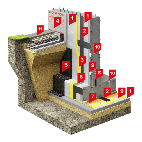 В качестве защитного и разделительного слоя в системе используется геотекстиль с поверхностной плотностью 500 г/м2. На горизонтальной части фундамента дополнительно предусмотрен слой полиэтиленовой плёнки и защитной цементно-песчаной стяжки. В качестве теплоизоляционного слоя на цокольной части здания используется экструзионный пенополистирол ТЕХНОНИКОЛЬ CARBON PROF. Между утеплителем и мембраной LOGICBASE V-SL необходимо предусматривать разделительный слой из геотекстиля с поверхностной плотностью 500 г/м2. Для защиты гидроизоляции от повреждения при обратной засыпке применятся профилированная мембрана PLANTER Standard.