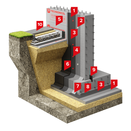 В качестве гидроизоляционной мембраны применяется двухслойная комбинация битумно-полимерных рулонных материалов Техноэласт ФУНДАМЕНТ ФИКС (первый слой) + Техноэласт ФУНДАМЕНТ (второй слой). На горизонтальное основание Техноэласт ФУНДАМЕНТ ФИКС укладывается свободно со сплавлением швов. Второй слой полностью наплавляется по первому слою. На вертикальной поверхности Техноэласт ФУНДАМЕНТ ФИКС крепится к основанию алюминиевой прижимной рейкой ТехноНИКОЛЬ ЭКО 2,0 или круглыми тарельчатыми держателями ТехноНИКОЛЬ, которые перекрываются вторым слоем.