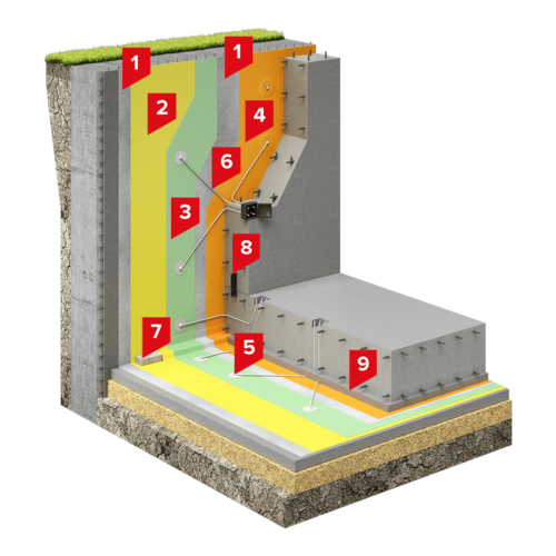 Система применяется для гидроизоляции подземных строительных конструкций различного назначения и класса ответственности, возводимых в котлованах с вертикальным ограждением (стена в грунте) в любых гидрогеологических условиях.