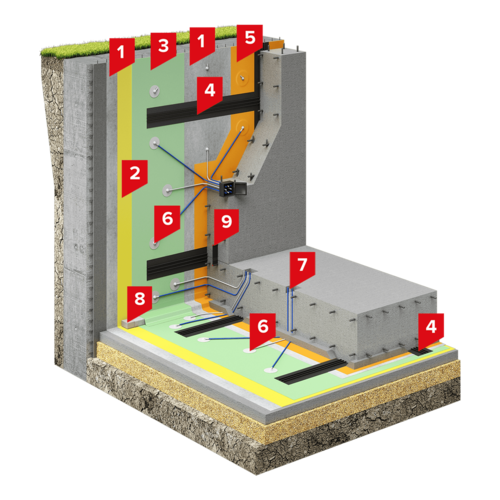 Система применяется для гидроизоляции подземных строительных конструкций различного назначения и класса ответственности, возводимых в котлованах с вертикальным ограждением (стена в грунте) в любых гидрогеологических условиях.