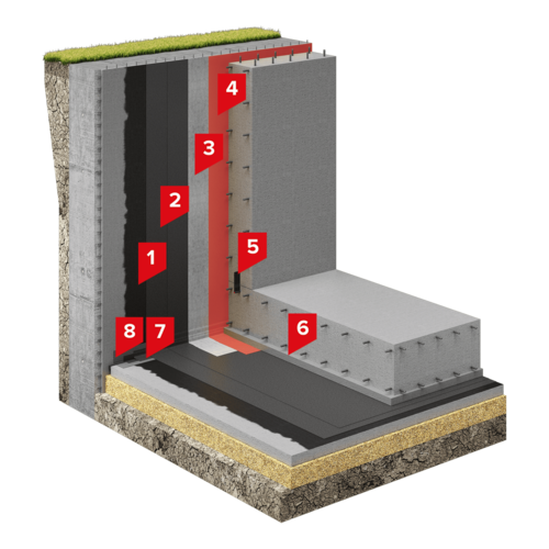 Система применяется для гидроизоляции подземных строительных конструкций различного назначения и класса ответственности, возводимых в котлованах с вертикальным ограждением (стена в грунте) в любых гидрогеологических условиях.