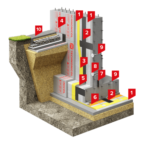 В качестве защитного и разделительного слоя в системе используется геотекстиль с поверхностной плотностью 500 г/м2. На горизонтальной части фундамента дополнительно предусмотрен слой полиэтиленовой плёнки и защитной цементно-песчаной стяжки. В качестве теплоизоляционного слоя подземной части здания используется экструзионный пенополистирол ТЕХНОНИКОЛЬ CARBON PROF, применение которого позволяет защитить конструкцию фундамента от промерзания, тем самым создавая оптимальные температурно-влажностные условия эксплуатируемого помещения. Между утеплителем и мембраной LOGICBASE V-SL необходимо предусматривать разделительный слой из геотекстиля с поверхностной плотностью 500 г/м2.
