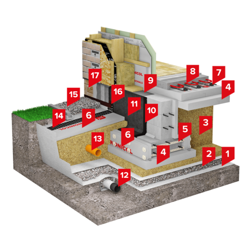 В качестве теплоизоляционного материала для вертикальной части фундамента и отмостки используется экструзионный пенополистирол марки ТЕХНОНИКОЛЬ CARBON ECO, который обладает низким водопоглощением и высокой прочностью на сжатие. Под подошвой фундамента и в конструкции пола используется экструзионный пенополистирол марки ТЕХНОНИКОЛЬ CARBON ECO SP, обладающий повышенными прочностными показателями. Для устройства гидроизоляции рекомендуется использовать Мастику ТЕХНОНИКОЛЬ № 21 (ТЕХНОМАСТ). Технология несъемной опалубки с применением экструзионного пенополистирола XPS ТЕХНОНИКОЛЬ CARBON ECO и Модульных элементов стяжек несъемной опалубки ТЕХНОНИКОЛЬ позволяет выполнять фундаментную ленту необходимой ширины под любой тип стен.