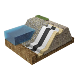 Система устройства противофильтрационного экрана (ПФЭ) из гидроизоляционной ПВХ-мембраны ECOBASE V-UV в плотинах и защитных дамбах из грунтовых материалов, а также в других гидротехнических сооружениях