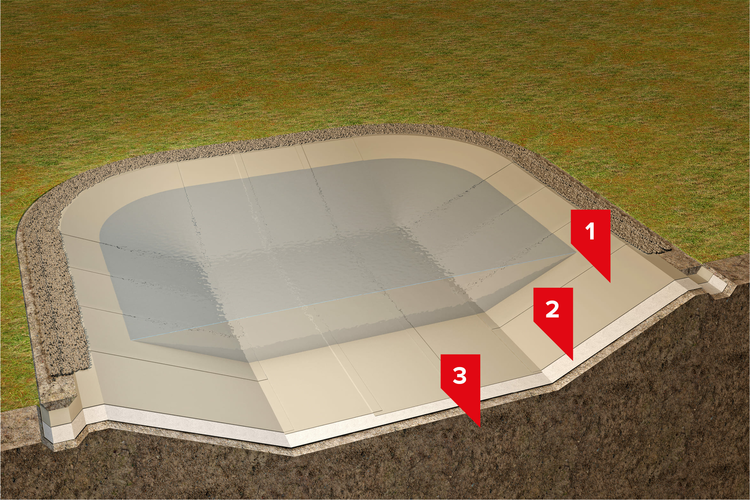 Швы полотен гидроизоляционной мембраны, скрепляются путем сварки горячим воздухом при помощи автоматического сварочного оборудования. Швы имеют особую конструкцию, т.к. они формируются после разогрева двумя прижимными роликами, между которыми имеется воздушный зазор около 15÷20 мм. Таким образом формируется двойной шов с центральным воздушным (проверочным) каналом, позволяющим контролировать герметичность швов. Герметичность швов проверяется давлением воздуха, который нагнетается в проверочный канал при помощи компрессора и специальной полой иглы. Для этого проверочный канал герметично заваривается по краям шва. После чего в него вводится проверочная игла. Проверочная игла со встроенным манометром и краном соединяется с компрессором или насосом для подачи воздуха. В проверочный канал подается воздух и создается избыточное давление воздуха от 1,5 до 2 бар. Такой метод инструментальной проверки всегда дает 100%-ный результат. В качестве подстилающего слоя в системе применяется геотекстильный материал с поверхностной плотностью 300 или 500 г/м², который монтируется непосредственно на спланированное грунтовое основание. При необходимости грунтовое основание может быть подготовлено при помощи отсыпки слоя песка. Крепление гидроизоляционной мембраны обеспечивается ее засыпкой в анкерной траншее. Защитный слой мембраны в случае необходимости может быть выполнен из геотекстильного материала с поверхностной плотностью 300 или 500 г/м² с последующей послойной отсыпкой на его поверхность мелкозернистого песка и щебня. Система может быть так же смонтирована с защитным слоем из монолитного бетона.