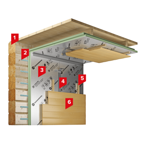 Система утепления стен и потолка парильного помещения – самый распространенный, простой и надежный способ сохранения тепла в бане. Конструкция стены состоит из теплоизоляционных плит LOGICPIR, алюминиевой ленты, деревянной обрешетки, высотой от 20 мм для создания воздушного зазора, а также внутренней отделки (вагонки). Теплоизоляционный слой изготавливается из жестких плит марки LOGICPIR Баня на основе высокоэффективного вспененного полиизоцианурата (PIR), облицованного фольгой. Особенность облицовки утеплителя позволяет отказаться от пароизоляционного слоя, т.к. фольга на поверхности LOGICPIR является паронепроницаемой. При проклейке стыков плит термостойкой самоклеящейся алюминиевой лентой получается непрерывный и герметичный паронепроницаемый слой, надежно предохраняющий всю конструкцию от увлажнения. Образовавшийся между фольгированным утеплителем и внутренней отделкой зазор не менее 20 мм позволяет максимально использовать преимущества LOGICPIR как отражательной теплоизоляции. Фольга не только не пропускает пар и влагу, но и, подобно зеркалу, выступает теплоотражателем, возвращая в помещение до 95 % энергии инфракрасных лучей от банной печи. Благодаря этому баня быстро нагреваться, а слой утеплителя является надежным барьером между высокой и низкой температурами, как теплая шуба, удерживая тепло в помещении. Планки каркаса могут располагаться как в горизонтальном, так и вертикальном направлении, регламентируя направление отделочного слоя евровагонки, изготовленной преимущественно из лиственных пород дерева.