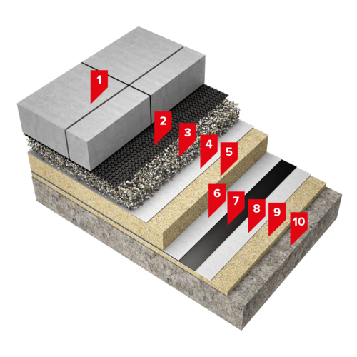 Для правильного процесса гидратации цементобетона в данной конструкции предусмотрена прослойка из Геосинтетической мембраны ПЛАНТЕР® Д, которая в свою очередь обладает более высокими прочностными показателями и высокой стойкостью к повреждениям в сравнении с традиционной аэродромной пленкой, также данная мембрана за счет своего профиля обеспечивает более высокие сдвиговые показатели между слоями.