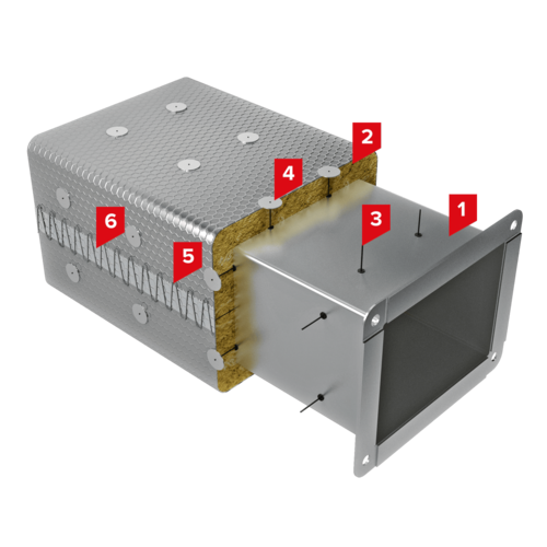 В качестве огнезащитного покрытия в системе ТН-ОГНЕЗАЩИТА Воздуховод применяется надежный, облегчающий монтаж и изящный по внешнему виду Мат Прошивной ТЕХНО 80 ГП (кашированный неармированной алюминиевой фольгой). Крепление прошивного мата ТЕХНО 80 ГП к воздуховоду может осуществляться как при помощи приварных штифтов и прижимных шайб, так и при помощи стальных бандажей и вязальной проволоки. Система ТН-ОГНЕЗАЩИТА Воздуховод виброустойчива и не разрушается во время работы системы вентиляции и кондиционирования, при этом кроме функции огнезащиты система выполняет функции тепло- и звукоизоляции. Огнестойкий воздуховод имеет предел огнестойкости (EI) от 30 до 240 минут в зависимости от толщины покрытия из Мата Прошивного ТЕХНО 80 ГП.