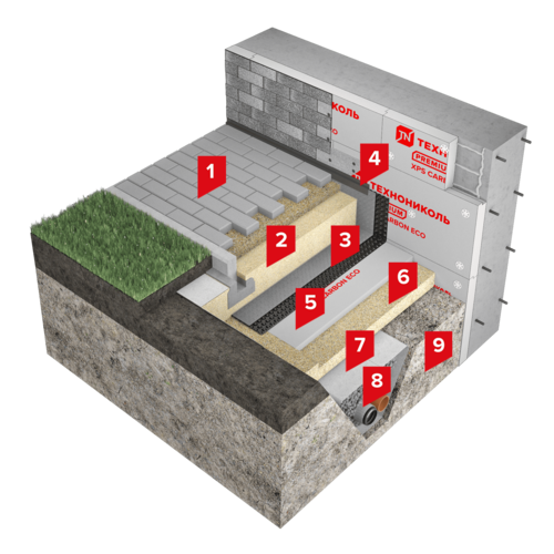 Система отмостки для благоустройства территорий и защиты фундамента. XPS ТЕХНОНИКОЛЬ обеспечивает тепловую защиту от морозного пучения в зоне фундамента. Система рассчитана на пешеходные нагрузки.