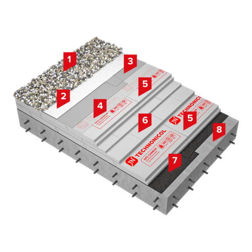 В качестве балласта в системе рекомендуется использовать - гальку окатанную промытую, фракцией 20–40 мм или гранитный щебень, фракцией 20–40 мм. Кровельный ковер выполняется из полимерной мембраны LOGICROOF V-GR, армированная стеклохолстом, которая обладает повышенной устойчивостью на прокол. Для дополнительной защиты полимерной мембраны от проколов на неё укладывается геотекстиль иглопробивной термофиксированный ТЕХНОНИКОЛЬ ПРОФ КРОВЛЯ 300 и только затем балластный слой. Для устройства теплоизоляционного слоя применяется утеплитель на основе экструзионного пенополистирола ТЕХНОНИКОЛЬ CARBON PROF, отличающийся высокими теплоизолирующими характеристиками и повышенной прочностью на сжатие. Между ПВХ мембранной и экструзионным пенополистиролом необходимо предусмотреть разделительный слой – стеклохолст, развесом не менее 100 г/м2. В качестве пароизоляции по бетонному основанию применяется наплавляемый материал Технобарьер. Он надежно защищает кровельный пирог от насыщения паром, при этом устойчив к возможным механическим повреждениям в условиях монтажа. Гибкость материала до минус 20 °С делает возможным устройство пароизоляции при отрицательных температурах.