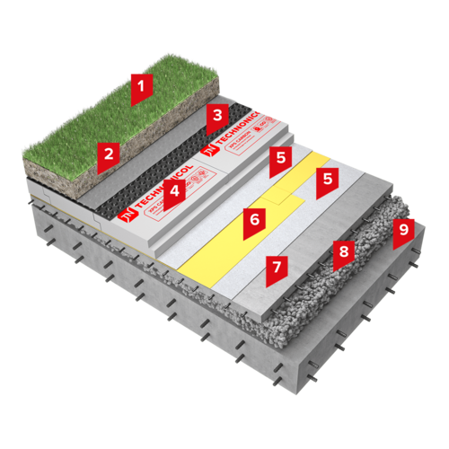 В системе ТН-КРОВЛЯ Барьер Грин поверх несущего железобетонного основания формируется уклонообразующий слой из керамзитобетона. Далее укладывается выравнивающая цементно-песчаная стяжка. В качестве подстилающего слоя применяется геотекстильное полотно плотностью не менее 300 г/м². Поверх подстилающего слоя монтируется водоизоляционный слой из полимерной мембраны LOGICBASE V-SL, которая обеспечивает высокую скорость монтажных работ, а также гарантирует возможность инструментального контроля герметичности швов. Далее укладывают утеплитель на основе экструзионного пенополистирола ТЕХНОНИКОЛЬ CARBON PROF в один слой. Между ПВХ мембранной и экструзионным пенополистиролом необходимо укладывать разделительный слой из геотекстильного полотна плотностью не менее 300 г/м². Поверх утеплителя XPS для обеспечения максимально быстрого удаления влаги из-под поверхности эксплуатируемого слоя устраивается дренажный слой из профилированной мембраны PLANTER Geo. Далее укладывается растительный грунт либо субстрат, толщина и вид которого подбираются с учетом требований для выбранных зеленых насаждений.