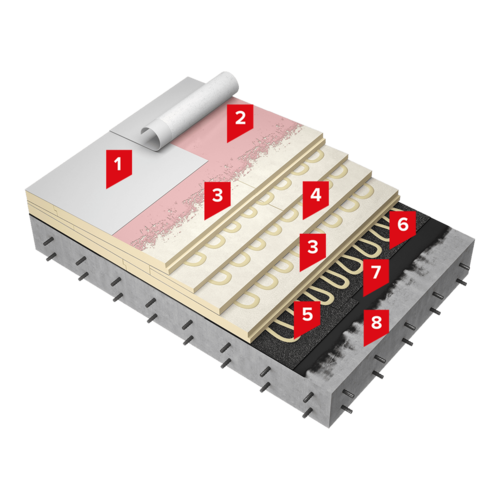Кровельный ковер выполняется из полимерной мембраны LOGICROOF V-GR FB с флисовой подложкой из ламинированного геотекстиля, которая приклеивается к поверхности плит LOGICPIR PROF СХМ/СХМ при помощи Контактного клея LOGICROOF Bond. Для приклеивания мембраны в зимних условиях при температуре от минус 15 °С до плюс 5°С необходимо применять Контактный клей LOGICROOF Bond Arctic. Благодаря противопожарным характеристики мембраны – Г3, РП2 и В2, конструкция соответствует группе пожарной опасности кровли КП0, что позволяет применять систему на кровлях больших площадей. Для устройства теплоизоляционного слоя применяются плиты на основе жесткого пенополиизоцианурата LOGICPIR PROF СХМ/СХМ с двусторонним кашированием из минерализированного стеклохолста, которые приклеиваются к пароизоляционному слою, а также между собой при помощи Клей-пены LOGICPIR. За счет низкой теплопроводности теплоизоляции, толщина и общий вес системы значительно снижены, по сравнению с системами с традиционным утеплителем, что позволяет применять её при реконструкции крыш с ограниченной способностью несущих конструкций, а высокая прочность и стойкость плит к сосредоточенным нагрузкам повышает межремонтный срок службы кровли. В качестве пароизоляции по бетонному основанию применяется наплавляемый материал Технобарьер. Он надежно защищает кровельный пирог от насыщения паром, при этом устойчив к возможным механическим повреждениям в условиях монтажа. Гибкость материала до минус 20 °С делает возможным устройство пароизоляции при отрицательных температурах.