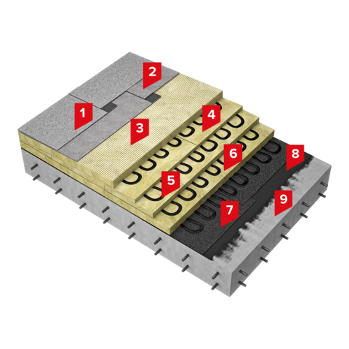 Для устройства теплоизоляции в два слоя применяются две марки утеплителя на основе каменной ваты ТЕХНОРУФ В ЭКСТРА и ТЕХНОРУФ Н ПРОФ, которые приклеиваются между собой на горячий битум или мастику.