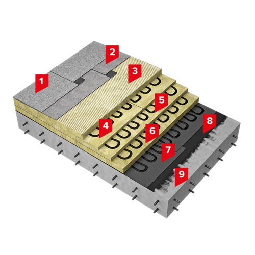 Для устройства теплоизоляционного слоя применяется марка утеплителя на основе каменной ваты ТЕХНОРУФ В ЭКСТРА. Плиты обладают достаточной прочностью, чтобы воспринимать пешеходную нагрузку от службы эксплуатации при частых осмотрах кровли и обслуживания размещенного на ней оборудования.