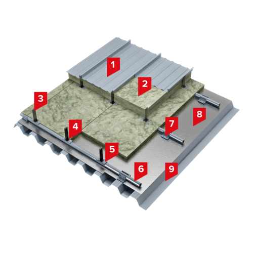 Теплоизоляционный слой монтируется из утеплителя на основе минерального стекловолокна — плит и рулонов ТЕХНОНИКОЛЬ «34 Стены и крыши ПРОФ». Благодаря меньшей прочности на сжатие этот материал идеально подходит для кровель сложной и неправильной формы и позволяет оптимизировать затраты на утеплитель.