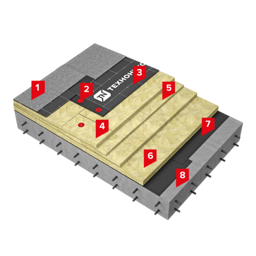 В конструкции применяются две серии плит ТЕХНОРУФ из каменной ваты: ТЕХНОРУФ В ОПТИМА в качестве верхнего теплоизоляционного слоя и ТЕХНОРУФ ПРОФ – в качестве нижнего слоя. Плиты ТЕХНОРУФ ПРОФ и ТЕХНОРУФ В ОПТИМА имеют высокую плотность, что обеспечивает восприятие и распределение нагрузки, действующей на поверхность кровли в ходе регулярного обслуживания оборудования, размещенного на ней.