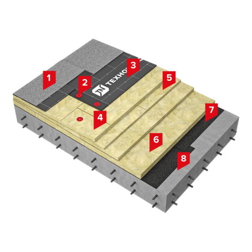 В качестве пароизоляции по бетонному основанию применяется наплавляемый материал Технобарьер. Технобарьер надежно защищает кровельный пирог от насыщения паром, при этом устойчив к возможным механическим повреждениям в условиях монтажа.