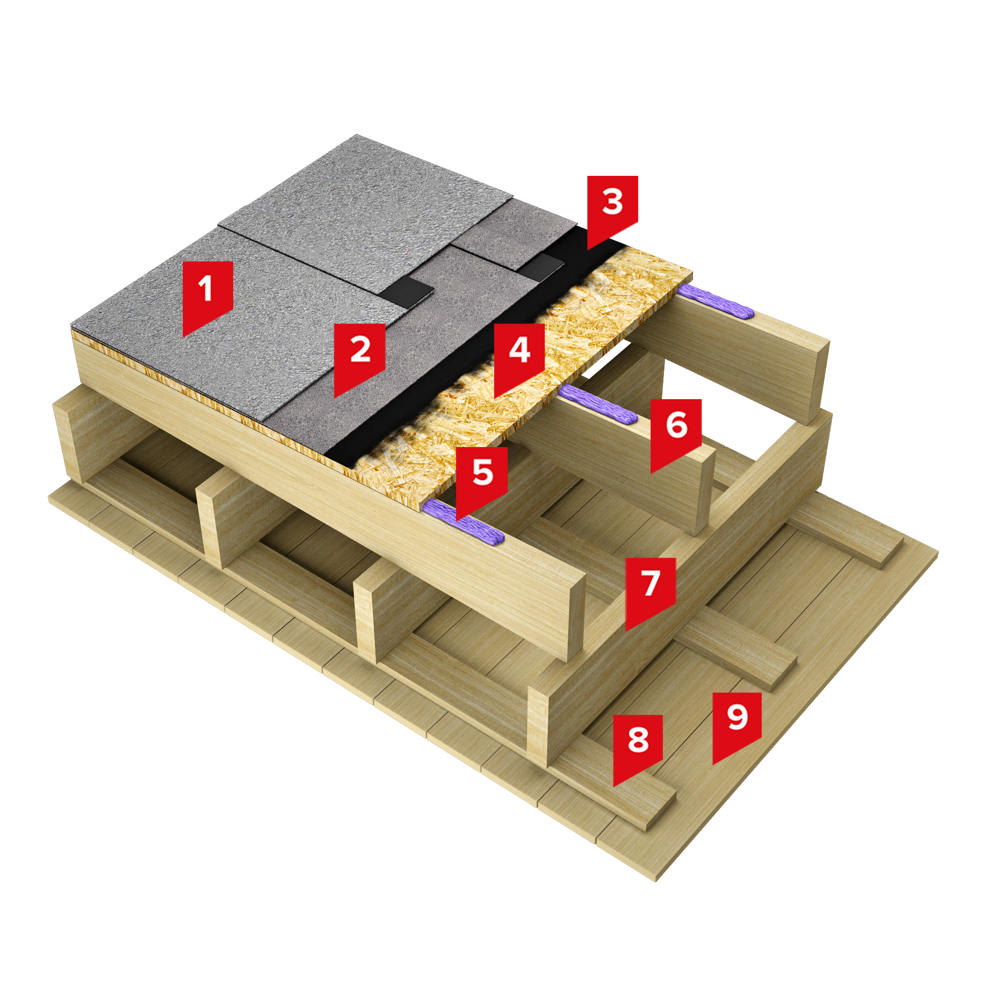 Сплошное основание в системе организовано из листов ОСП (18 мм) или фанеры ФСФ (12 мм), приклеенных к деревянным балкам полиуретановым клеем ТЕХНОНИКОЛЬ 508 PROFESSIONAL.