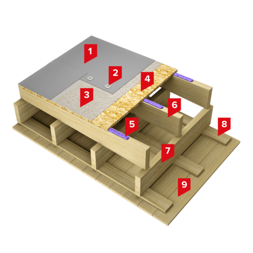 Сплошное основание в системе организовано из листов ОСП (18 мм) или фанеры ФСФ (12 мм), приклеенных к деревянным балкам полиуретановым клеем ТЕХНОНИКОЛЬ 508 PROFESSIONAL.
