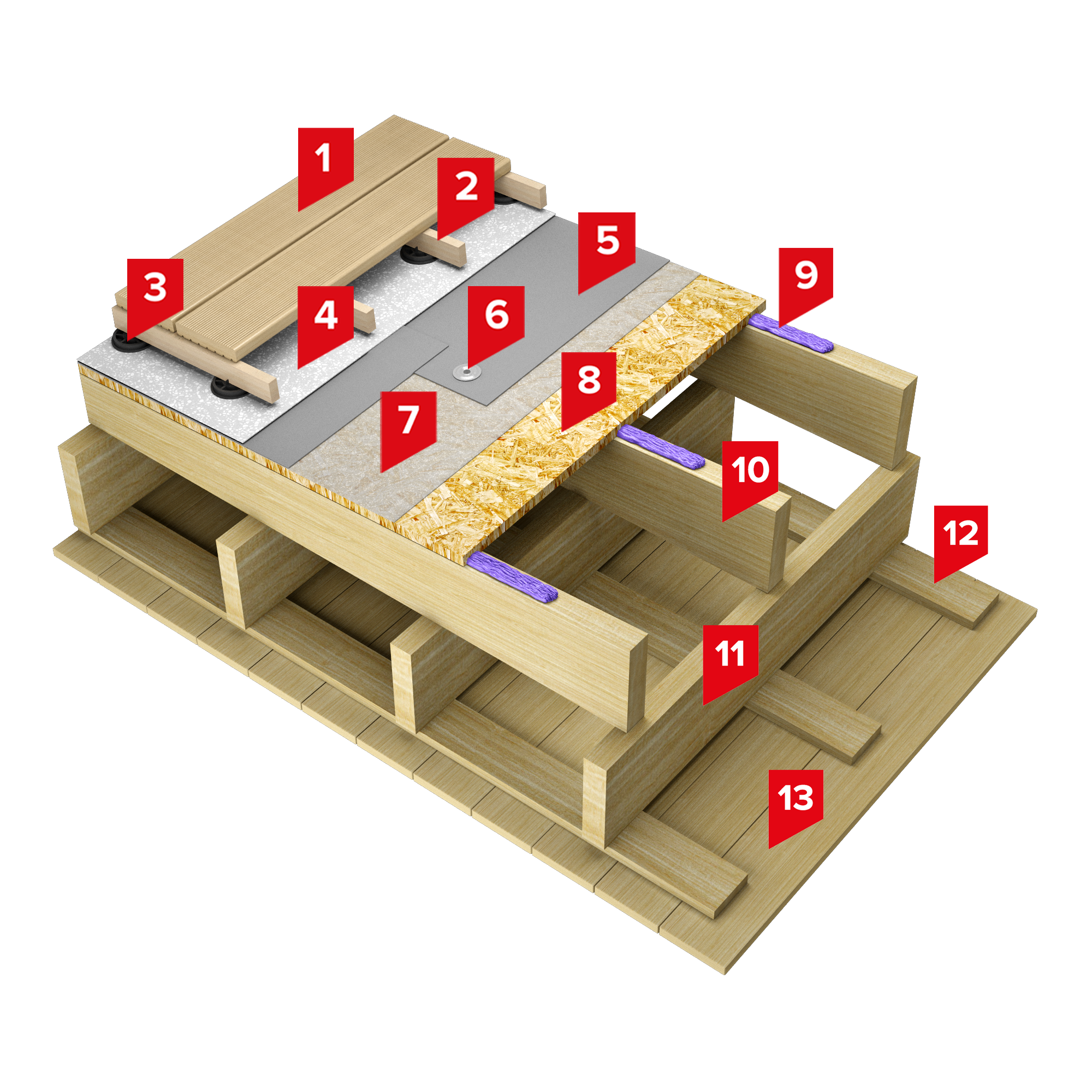 Сплошное основание в системе организовано из листов ОСП (18 мм) или фанеры ФСФ (12 мм), приклеенных к деревянным балкам полиуретановым клеем ТЕХНОНИКОЛЬ 508 PROFESSIONAL.