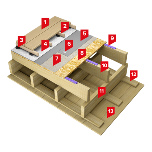 Сплошное основание в системе организовано из листов ОСП (18 мм) или фанеры ФСФ (12 мм), приклеенных к деревянным балкам полиуретановым клеем ТЕХНОНИКОЛЬ 508 PROFESSIONAL.