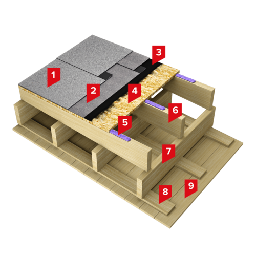 Сплошное основание в системе организовано из листов ОСП (18 мм) или фанеры ФСФ (12 мм), приклеенных к деревянным балкам полиуретановым клеем ТЕХНОНИКОЛЬ 508 PROFESSIONAL.