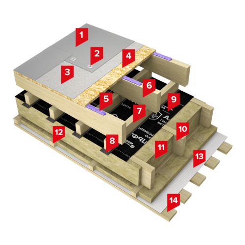 В качестве основного утепления применяются негорючие плиты из стекловолокна ТЕХНОНИКОЛЬ 34 PN Стены и крыши или из каменной ваты ТЕХНОЛАЙТ ЭКСТРА, смонтированные между стропильными балками, а также между брусками контробрешетки снизу. Утеплитель защищен сверху диффузионной мембраной Пленка ТЕХНОНИКОЛЬ АЛЬФА ТОП.
