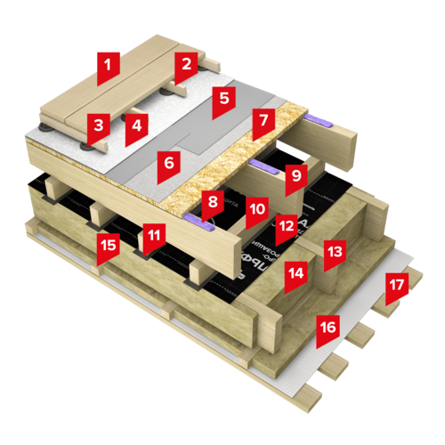 Сплошное основание в системе организовано из листов ОСП (18 мм) или фанеры ФСФ (12 мм), приклеенных к деревянным балкам полиуретановым клеем ТЕХНОНИКОЛЬ 508 PROFESSIONAL.