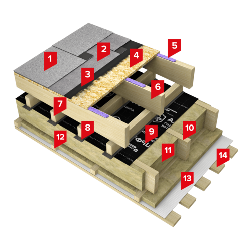 В качестве основного утепления применяются негорючие плиты из стекловолокна ТЕХНОНИКОЛЬ 34 PN Стены и крыши или из каменной ваты ТЕХНОЛАЙТ ЭКСТРА, смонтированные между стропильными балками, а также между брусками контробрешетки снизу. Утеплитель защищен сверху диффузионной мембраной Пленка ТЕХНОНИКОЛЬ АЛЬФА ТОП.