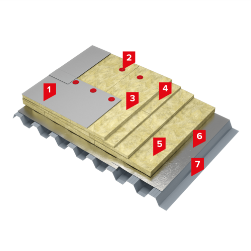 Для устройства теплоизоляционного слоя применяется две марки утеплителя на основе каменной ваты. ТЕХНОРУФ В ЭКСТРА – более прочный утеплитель, применяемый для устройства верхнего слоя теплоизоляции, который перераспределят внешнюю нагрузку на нижний слой теплоизоляции. Плиты ТЕХНОРУФ Н ПРОФ имеют меньшую прочность на сжатие и применяется для устройства нижнего слоя теплоизоляции, что позволяет сэкономить на общей стоимости утеплителя.