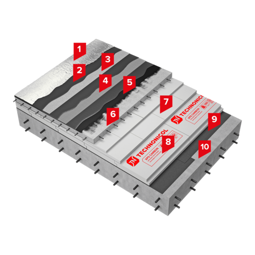 В качестве пароизоляции по бетонному основанию применяется наплавляемый материал Технобарьер. Он надёжно защищает кровельный пирог от насыщения паром, при этом устойчив к возможным механическим повреждениям в условиях монтажа.