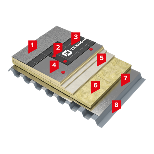 В качестве нижнего слоя теплоизоляции применяются негорючие плиты из каменной ваты ТЕХНОРУФ Н ПРОФ толщиной не менее 50 мм, что обеспечивает системе высокие противопожарные характеристики. В качестве верхнего слоя теплоизоляции применяется утеплитель на основе жесткого пенополиизоцианурата LOGICPIR PROF Ф/Ф, отличающийся высокими теплоизолирующими характеристиками и поверхностной жесткостью.