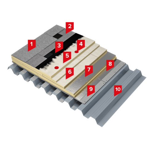В качестве верхнего слоя теплоизоляции применяется утеплитель на основе жесткого пенополиизоцианурата LOGICPIR PROF СХМ/СХМ, отличающийся высокими теплоизолирующими характеристиками и поверхностной жесткостью.