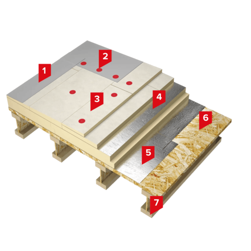Кровельный ковер выполняется из полимерной мембраны LOGICROOF V-RP, которая имеет высокие противопожарные характеристики – Г2, РП1 и В2. В случае применения ПВХ мембран ТехноНИКОЛЬ конструкция соответствует группе пожарной опасности кровли КП0, что позволяет применять систему без ограничений по площади кровли. Для устройства теплоизоляционного слоя применяются плиты на основе жесткого пенополиизоцианурата LOGICPIR PROF Ф/Ф, имеющие группу горючести Г1. За счет низкой теплопроводности теплоизоляции, толщина и общий вес системы значительно снижены, по сравнению с системами с традиционным утеплителем. Высокая прочность и стойкость плит LOGICPIR PROF Ф/Ф к сосредоточенным нагрузкам повышает межремонтный срок службы кровли. В качестве пароизоляции по деревянному сплошному настилу (например, плитам OSB-3) применяется алюминизированная мембрана Паробарьер С (А500 или Ф1000). В зависимости от условий эксплуатации, типа объекта, условий влажности в помещении может быть выбрана определенная марка пароизоляционного материала: