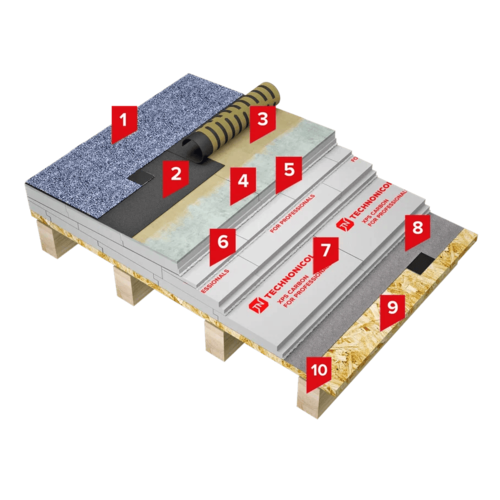 Кровельный ковер состоит из двух слоев битумно-полимерного материала. В системе используется двухслойный «дышащий» битумно-полимерный кровельный ковер, который позволяет избежать образования вздутий на ее поверхности, за счет применения в качестве нижнего слоя специальный материал Унифлекс ВЕНТ ЭПВ. Верхний слой из битумно-полимерного материала Техноэласт ДЕКОР ЭКП, наплавляется на нижний слой кровли. В конструкции применены в качестве нижнего слоя теплоизоляционные плиты из Экструзионный пенополистирол ТЕХНОНИКОЛЬ CARBON ECO, в качестве верхнего теплоизоляционного слоя – Теплостяжка Мастер (Сэндвич ТЕХНОНИКОЛЬ Ц-XPS), который также является основанием под наплавляемую гидроизоляцию. Теплоизоляционные плиты приклеиваются к пароизоляционному слою и между собой на клей-пену ТЕХНОНИКОЛЬ PROFESSONAL для пенополистирола. В качестве основного уклонообразующего слоя применяется XPS ТЕХНОНИКОЛЬ CARBON PROF SLOPE-2,1%, формирование контруклонов между воронками выполняется при помощи XPS ТЕХНОНИКОЛЬ CARBON PROF SLOPE-4,2%. В качестве пароизоляции по деревянному сплошному настилу (например, плитам OSB-3) применяется самоклеящийся битумно-полимерный материал Унифлекс С ЭМС.