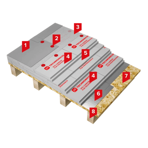 Кровельный ковер выполняется из полимерной мембраны LOGICROOF V-RP, которая имеет высокие противопожарные характеристики – Г2, РП1 и В2. В качестве разделительного слоя применяется стеклохолст 100 г/м2. В качестве основного теплоизоляционного слоя применяется XPS ТЕХНОНИКОЛЬ CARBON ECO. Данный материал не впитывает воду, не набухает и не дает усадки, биологически стоек и не подвержен гниению. Высокая прочность позволяет получить ровное и одновременно жесткое основание, что существенно увеличивает срок эксплуатации всей теплоизоляционной системы. В качестве основного уклонообразующего слоя применяется XPS ТЕХНОНИКОЛЬ CARBON PROF SLOPE-2,1%, формирование контруклонов между воронками выполняется при помощи XPS ТЕХНОНИКОЛЬ CARBON PROF SLOPE-4,2%. В качестве пароизоляции по деревянному сплошному настилу (например, плитам OSB-3) применяется алюминизированная мембрана Паробарьер С (А500 или Ф1000). В зависимости от условий эксплуатации, типа объекта, условий влажности в помещении может быть выбрана определенная марка пароизоляционного материала: