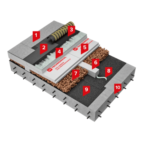 В конструкции применены в качестве нижнего слоя теплоизоляционные плиты из экструзионного пенополистирола ТЕХНОНИКОЛЬ CARBON PROF, в качестве верхнего теплоизоляционного слоя - экструзионный пенополистирол Сэндвич ТЕХНОНИКОЛЬ Ц-XPS. Теплоизоляционные плиты укладываются свободно. Панели теплоизоляционные «XPS Сэндвич ТЕХНОНИКОЛЬ Ц-XPS» представляют собой плиты из экструзионного пенополистирола, покрытые защитным слоем из высокопрочной цементной стяжки. Наличие защитного слоя из высокопрочной цементной стяжки избавляет от необходимости устраивать сборную или цементно-песчаную стяжку, значительно упрощая монтаж и обеспечивает отличные эксплуатационные свойства.