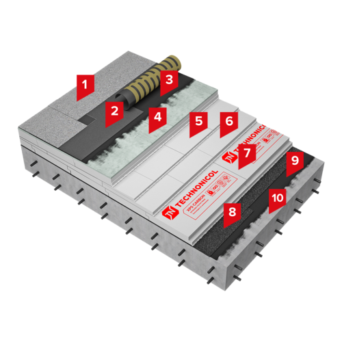 В конструкции применены в качестве нижнего слоя теплоизоляционные плиты из экструзионного пенополистирола ТЕХНОНИКОЛЬ CARBON PROF, в качестве верхнего теплоизоляционного слоя - экструзионный пенополистирол Сэндвич ТЕХНОНИКОЛЬ Ц-XPS. Теплоизоляционные плиты приклеиваются к пароизоляционному слою и между собой на клей-пену ТЕХНОНИКОЛЬ PROFESSIONAL для пенополистирола. Панели теплоизоляционные «XPS Сэндвич ТЕХНОНИКОЛЬ Ц-XPS» представляют собой плиты из экструзионного пенополистирола, покрытые защитным слоем из высокопрочной цементной стяжки. Наличие защитного слоя из высокопрочной цементной стяжки избавляет от необходимости устраивать сборную или цементно-песчаную стяжку, значительно упрощая монтаж и обеспечивает отличные эксплуатационные свойства.