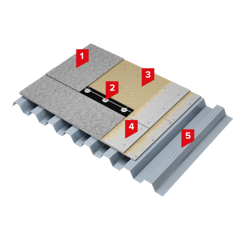 Техноэласт СОЛО РП1 крепится к профилированному настилу через сборную стяжку механически с помощью круглого тарельчатого держателя и сверлоконечного самореза. Применение механического крепления позволяет увеличить скорость монтажа, а благодаря применению высокопрочной основы битумно-полимерной мембраны система имеет высокую механическую прочность.
