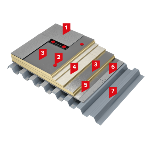 Для устройства теплоизоляционного слоя применяются плиты на основе жесткого пенополиизоцианурата LOGICPIR PROF Ф/Ф, имеющие группу горючести Г1. Высокая прочность и стойкость плит LOGICPIR PROF Ф/Ф к сосредоточенным нагрузкам повышает межремонтный срок службы кровли.