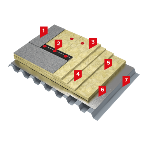 В конструкции применяются две серии плит ТЕХНОРУФ из каменной ваты: ТЕХНОРУФ В ОПТИМА в качестве верхнего теплоизоляционного слоя и ТЕХНОРУФ В ПРОФ – в качестве нижнего слоя. Плиты ТЕХНОРУФ В ОПТИМА и ТЕХНОРУФ В ПРОФ имеют высокую плотность, что обеспечивает восприятие и распределение нагрузки, действующей на поверхность кровли в ходе регулярного обслуживания оборудования, размещенного на ней.