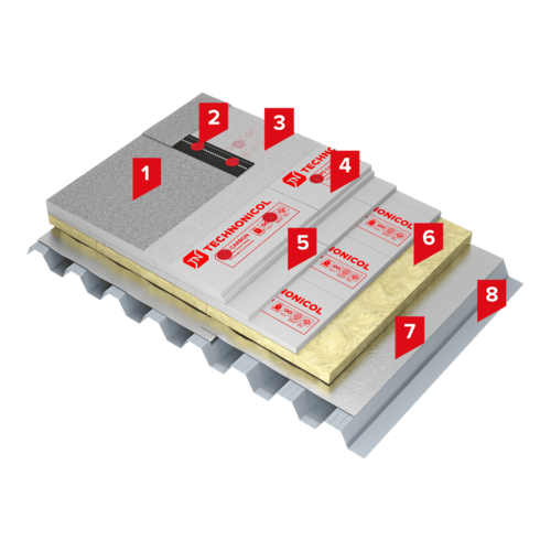 В качестве верхнего слоя теплоизоляции применяется утеплитель на основе экструзионного пенополистирола ТЕХНОНИКОЛЬ CARBON PROF, отличающийся высокими теплоизолирующими характеристиками и повышенной прочностью на сжатие. Между водоизоляционным ковром и экструзионным пенополистиролом необходимо уложить разделительный слой – стеклохолст, развесом не менее 100 г/м².