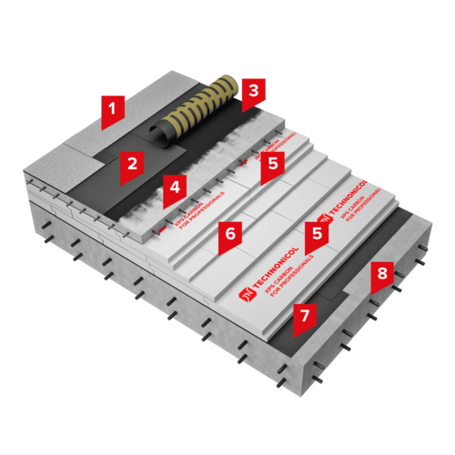 В качестве основного слоя теплоизоляции применяется утеплитель экструзионный пенополистирол ТЕХНОНИКОЛЬ CARBON PROF, отличающийся высокими теплоизолирующими характеристиками и повышенной прочностью на сжатие. В качестве материалов для формирования уклонов и контруклонов на кровле применяется набор изделий из XPS ТЕХНОНИКОЛЬ CARBON PROF SLOPE.