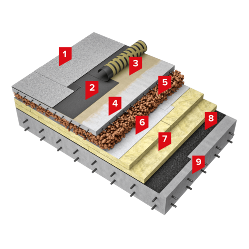 В качестве теплоизоляции в системе применяется негорючий утеплитель из каменной ваты ТЕХНОРУФ Н ПРОФ. Для исключения увлажнения теплоизоляционного слоя в процессе устройства цементно-песчаной стяжки в решении применяется геотекстиль иглопробивной термофиксированный ТЕХНОНИКОЛЬ ПРОФ 300.