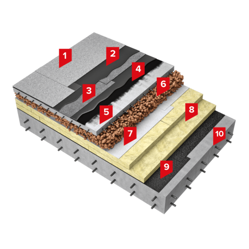 В качестве теплоизоляции в системе применяется негорючий утеплитель из каменной ваты ТЕХНОРУФ Н ПРОФ. Для исключения увлажнения теплоизоляционного слоя в процессе устройства цементно-песчаной стяжки в решении применяется геотекстиль иглопробивной термофиксированный ТЕХНОНИКОЛЬ ПРОФ 300.
