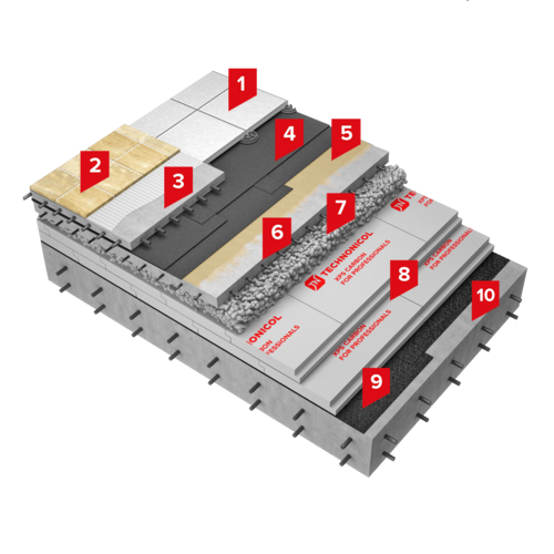 В системе применяется двухслойный водоизоляционный ковер из наплавляемых битумно-полимерных материалов Техноэласт ЭПП.