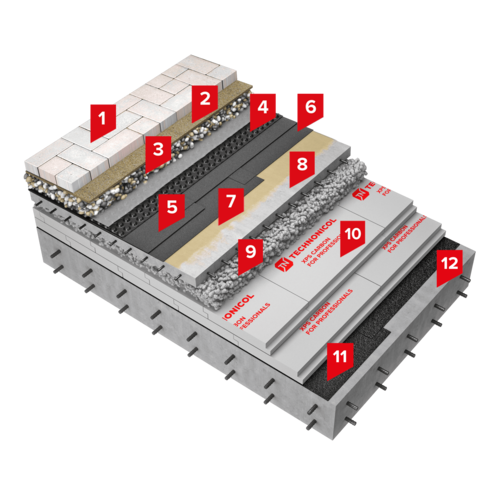 Система разработана с учетом пешеходных нагрузок и применяется при строительстве открытых террас на крышах малоэтажных домов и рекомендуется применять для эффективного и эстетического использования, например, для дополнительного места для отдыха.
