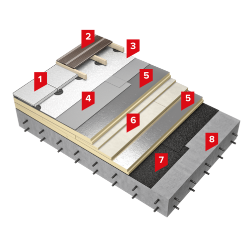 В качестве балласта и эксплуатируемого слоя в системе рекомендуется использовать - тротуарную плитку, толщиной не менее 40 мм, установленную на регулируемые опоры. Кровельный ковер выполняется из полимерной мембраны LOGICROOF V-GR, армированной стеклохолстом, которая обладает повышенной устойчивостью на прокол. Для дополнительной защиты полимерной мембраны от проколов на неё укладывается иглопробивной термофиксированный геотекстиль ТЕХНОНИКОЛЬ ПРОФ КРОВЛЯ 300 развесом не менее 300 г/м2 и только затем эксплуатируемый слой. Для устройства теплоизоляционного слоя применяются плиты на основе жесткого пенополиизоцианурата LOGICPIR PROF Ф/Ф, имеющие группу горючести Г1. За счет низкой теплопроводности теплоизоляции, толщина и общий вес системы значительно снижены, по сравнению с системами с традиционным утеплителем.