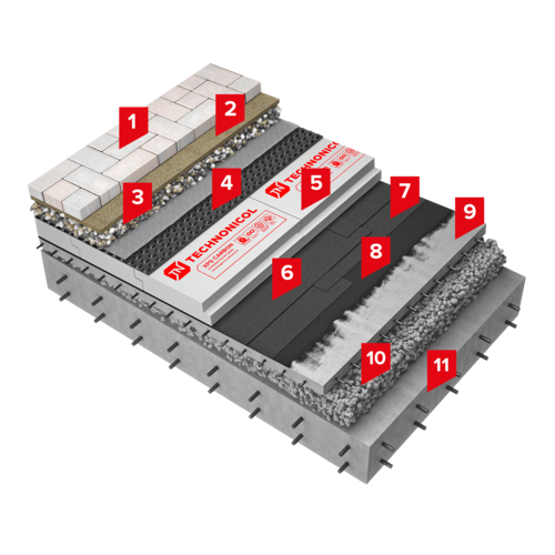 В качестве основного слоя теплоизоляции применяется утеплитель экструзионный пенополистирол ТЕХНОНИКОЛЬ CARBON PROF, отличающийся низким водопоглощением и высокой прочностью на сжатие, что соответствует требованиям предъявляемых к теплоизоляционным материалам в инверсионных крышах согласно п.5.4.3 СП 17.13330.2017.