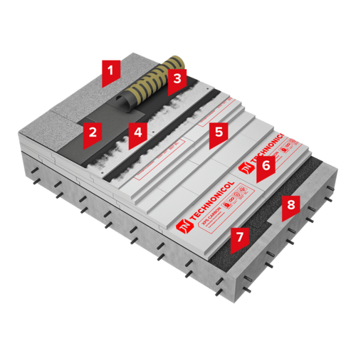 Кровельный ковер состоит из двух слоев битумно-полимерного материала. В системе используется двухслойный «дышащий» битумно-полимерный кровельный ковер, который позволяет избежать образования вздутий на ее поверхности, за счет применения в качестве нижнего слоя специальный материал Унифлекс ВЕНТ ЭПВ. Верхний слой из битумно-полимерного материала Техноэласт ПЛАМЯ СТОП (с повышенными противопожарными характеристиками – РП1, В2) наплавляется на нижний слой кровли.